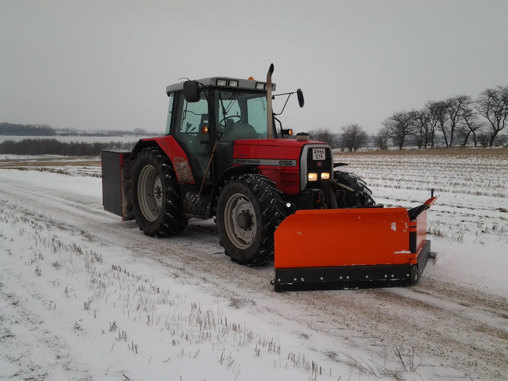 Snerydning udføres med traktor med sneplov.